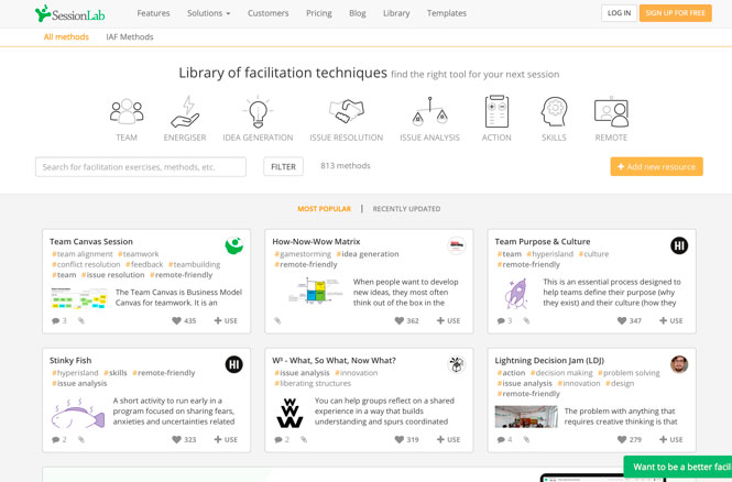 Это, конечно, не совсем онлайн-инструмент, но в работе точно пригодится. В одном месте собраны большинство известных (и не очень) техник фасилитации командной работы. Техники удобно разбиты по направлениям: командная работа, повышение энергичности, генерация идей, поиск решений, анализ проблем, планирование. Даны описания каждой техники, ее цели, задачи, последовательность реализации, а также рекомендации в каких случаях она может быть наиболее полезна. Техники постоянно добавляются по принципу открытого сообщества – вы тоже можете внести пару своих. Пользуйтесь на здоровье.