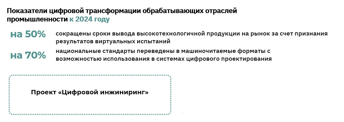 Реализация проекта должна будет решить несколько важных задач для цифровой трансформации промышленности: повышение эффективности использования основных фондов, сырья и материалов, расширение технологических, производственных и сбытовых возможностей предприятий, обеспечение доступности информации о технологических и производственных возможностях предприятий, повышение доли предприятий, использующих технологии предиктивной аналитики и промышленного интернета вещей, разработка и внедрение российского инженерного программного обеспечения и цифровых платформ по ключевым классам (CAD/CAE/CAM/PLM/MES/PDM/MDM и др.), установление условий допуска иностранного инженерного программного обеспечения при осуществлении закупок (запреты, ограничения, квоты, преференции при закупках отечественного программного обеспечения).
