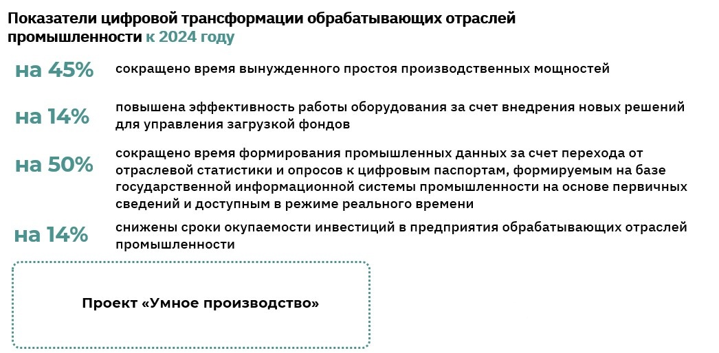 Проект «Умное производство» направлен на формирование эффективной инфраструктуры и системы поддержи внедрения отечественного программного обеспечения п программно-аппаратных комплексов.