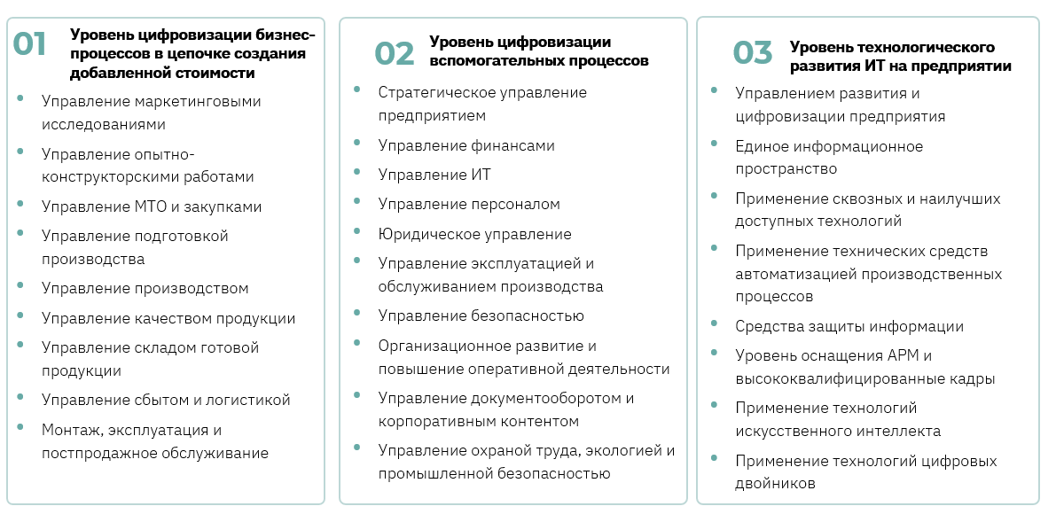 Система направлений оценки цифровой зрелости предприятия включает в себя три уровня:
