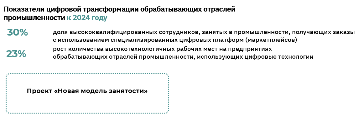 Новая модель занятость в промышленном секторе предполагает создание биржи компетенций в целях увеличения удельного веса интеллектуального труда человека в производственном процессе эффективности использования человеческого капитала в промышленной сфере и создание сервисов, нивелирующих нехватку необходимых для цифровой трансформации компетенций и позволяющих обеспечить повышение производительности труда.