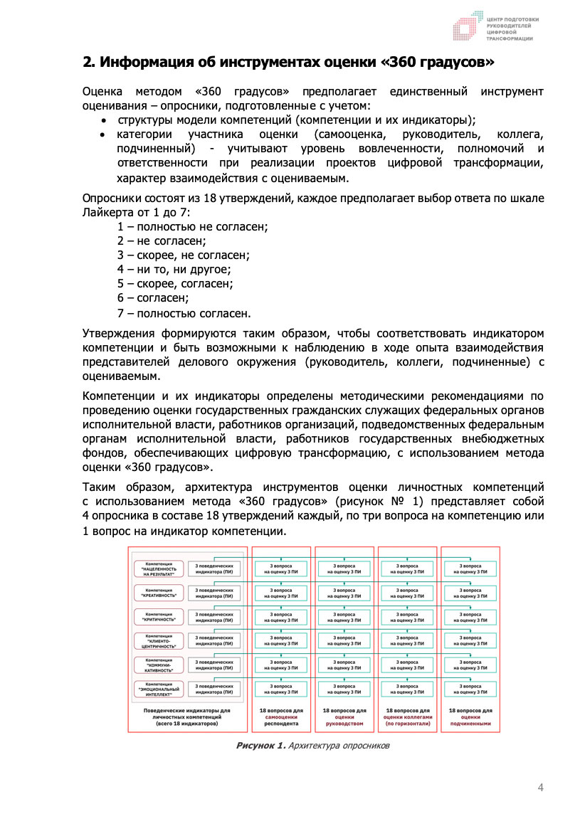 - Классический метод оценки только личностных компетенций с опросниками, адаптированными для команд цифровой трансформации. Изначально опросники разрабатывались для оценки заместителей руководителей федеральных органов исполнительной власти, ответственных за цифровую трансформацию (CDTO), могут использоваться для оценки руководителей команд цифровой трансформации.